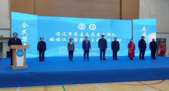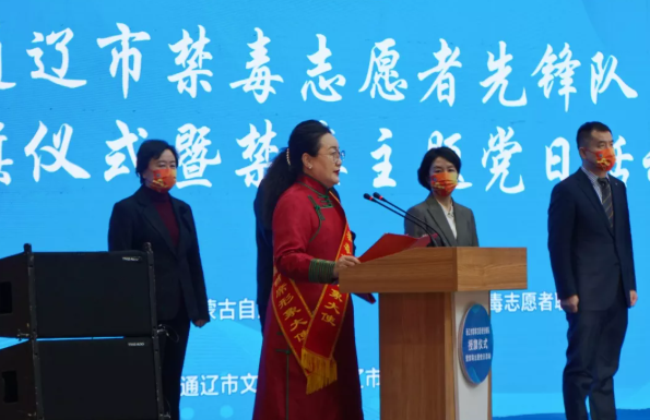 本次活动在全体人员高唱《中华人民共和国国歌》中拉开序幕。通辽市委常委、宣传部部长王玲宣布通辽市禁毒志愿者先锋队成立。