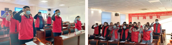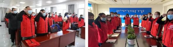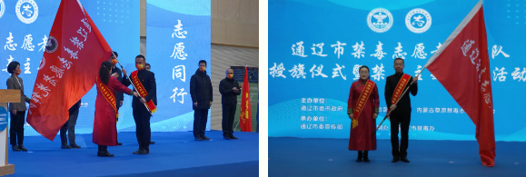内蒙古禁毒首席形象大使陶迎春向通辽市禁毒志愿者先锋队授旗,通辽市禁毒志愿者先锋队队长姜继飞接旗并领誓,重温入党誓词,进行禁毒宣誓。