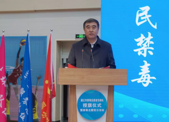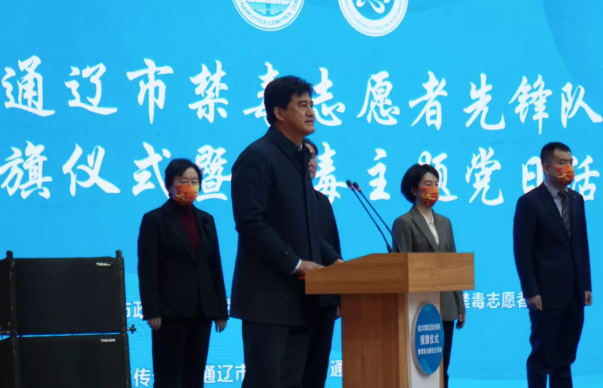 近日,由内蒙古通辽市委市政府、内蒙古自治区禁毒委员会办公室、内蒙古草原禁毒志愿者联合会主办,通辽市委宣传部、通辽市文明办、通辽市禁毒委员会办公室承办的“通辽市禁毒志愿者先锋队授旗仪式暨禁毒主题党日活动”在通辽职业学院举行。内蒙古自治区禁毒委副主任、禁毒办主任、自治区公安厅副厅长张子军,通辽市委副书记、市长、市禁毒委主任郭玉峰出席活动并讲话。内蒙古自治区政协常委、自治区妇联执委、农工党内蒙古区委社会法律工作委员会副主任、内蒙古禁毒首席形象大使陶迎春受邀为通辽市禁毒志愿者先锋队授旗。通辽市副市长、禁毒委常务副主任、公安局党委书记、局长王勇主持授旗仪式。