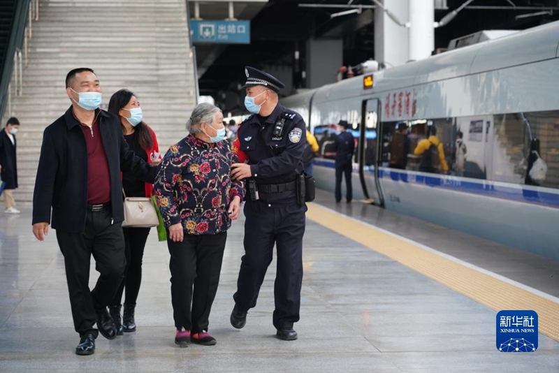 民警杨仁德在福州车站协助旅客出行(1月8日摄)。 新华社发