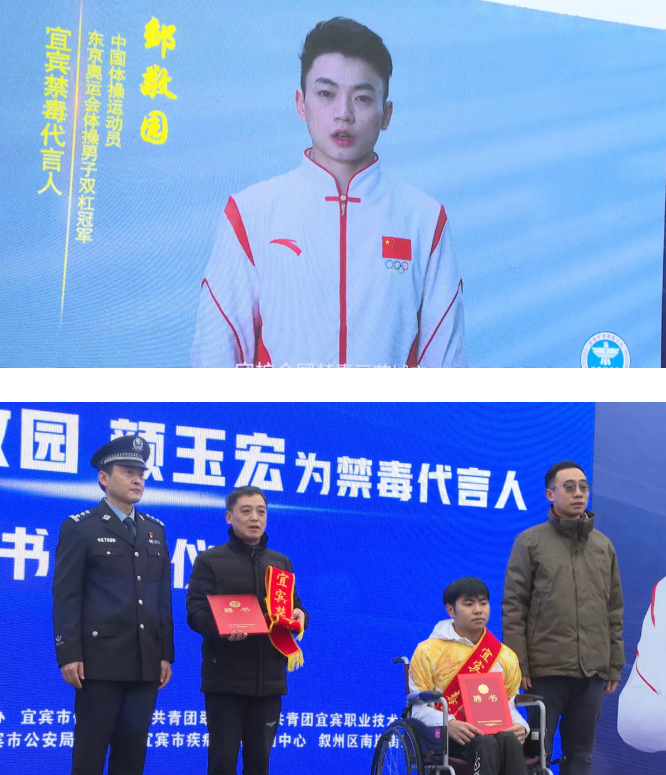 宜宾市禁毒办负责人宣读聘请邹敬园、颜玉宏为宜宾禁毒代言人的决定并为他们颁发聘书。