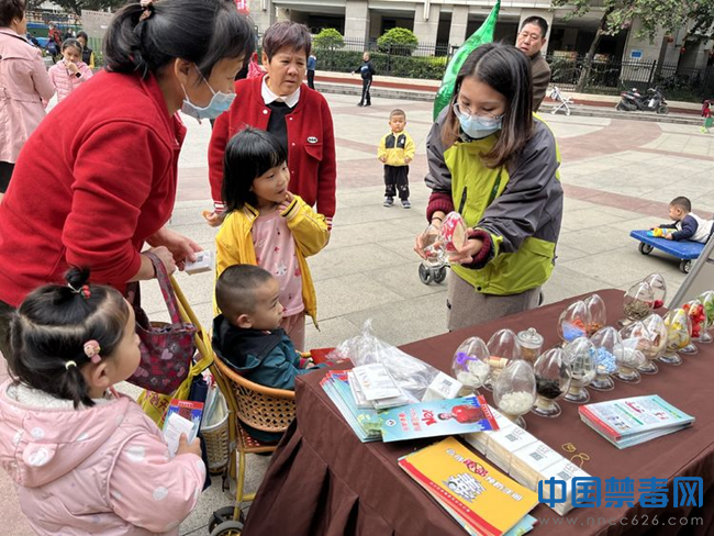 图为禁毒社工向群众展示毒品仿真模型。中国禁毒网发