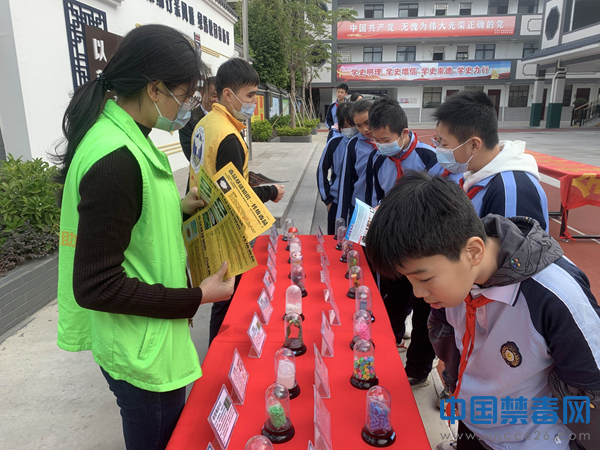 图为禁毒专干向学生展示毒品仿真模型。中国禁毒网发