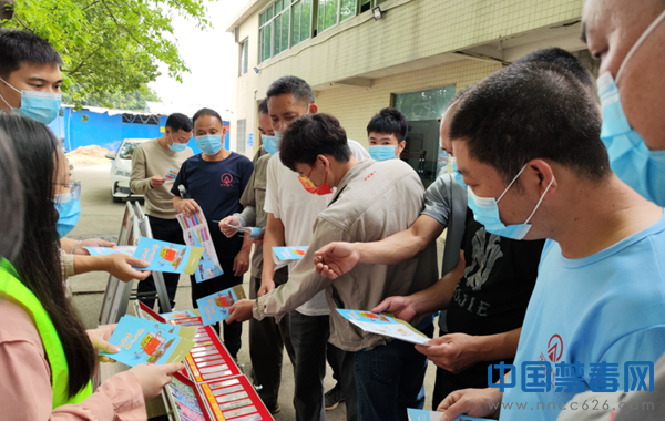 图为禁毒工作人员向企业员工派发禁毒宣传单张。中国禁毒网发