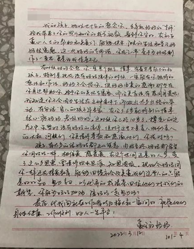 “这回,妈妈也给我写信了吗?”“有呀,我念给你听……”信中,张某为孩子送上了生日祝福和自己对他的期许,叮嘱他要乖乖听话,等她回来。