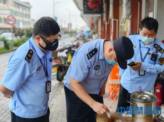 图为执法人员使用快速检测板对食用汤底、卤料等进行现场检测。中国禁毒网发