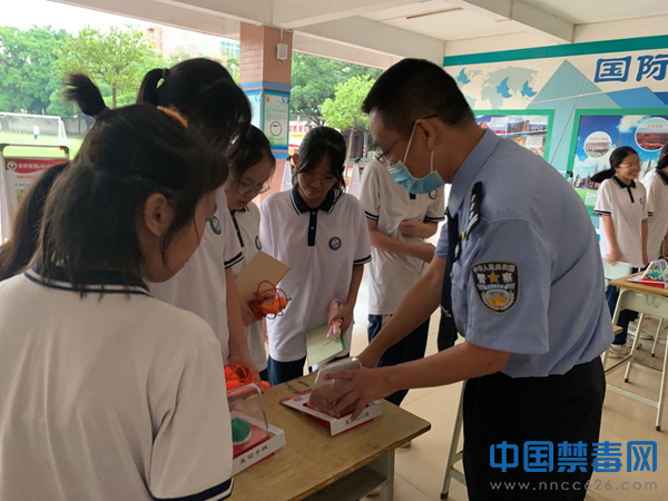 图为工作人员向学生展示毒品仿真模型。中国禁毒网发