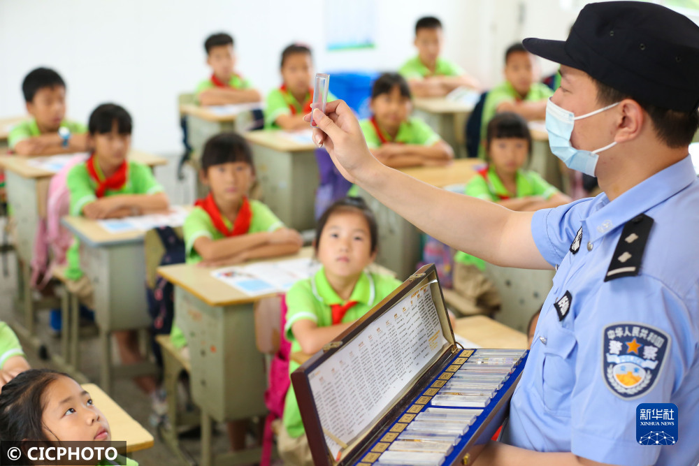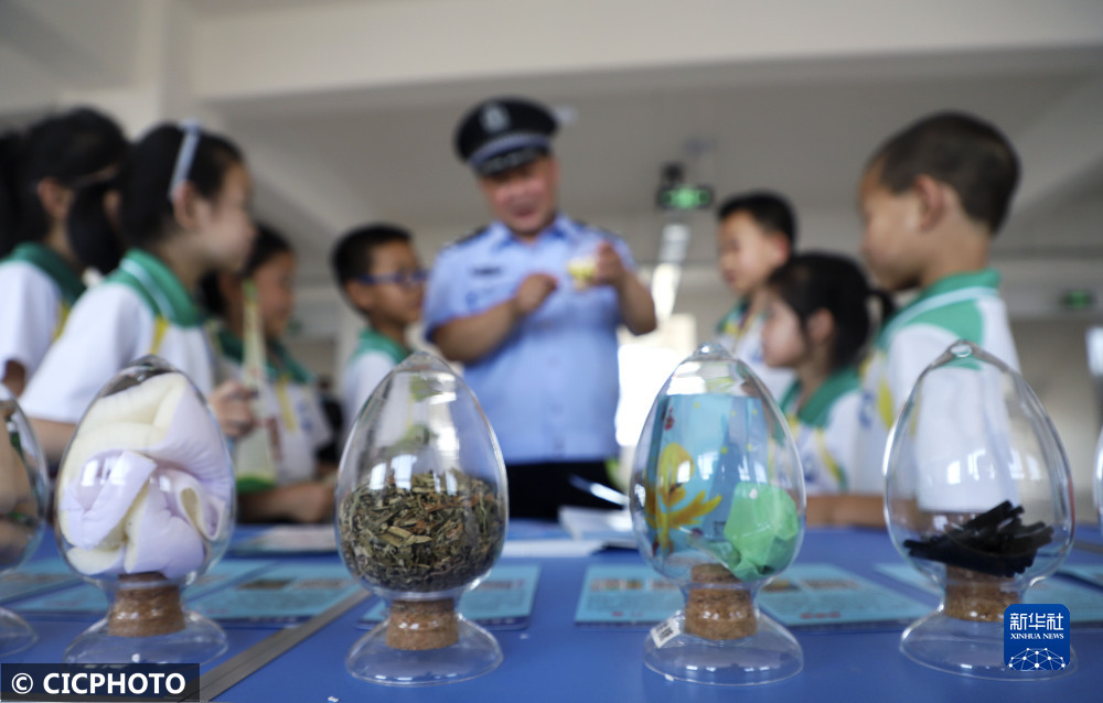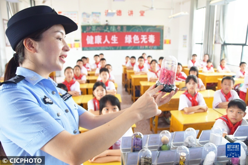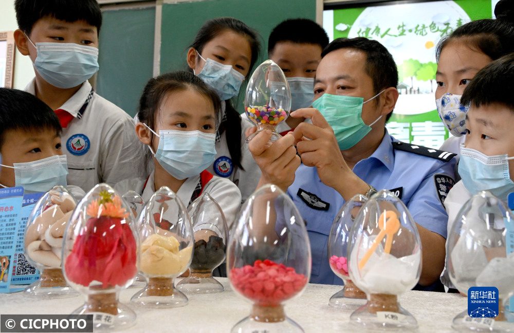 ↑2022年6月23日,在湖南省永州市江永县第一小学,民警用仿真毒品样本向学生讲解毒品危害。CICPHOTO/田如瑞 摄