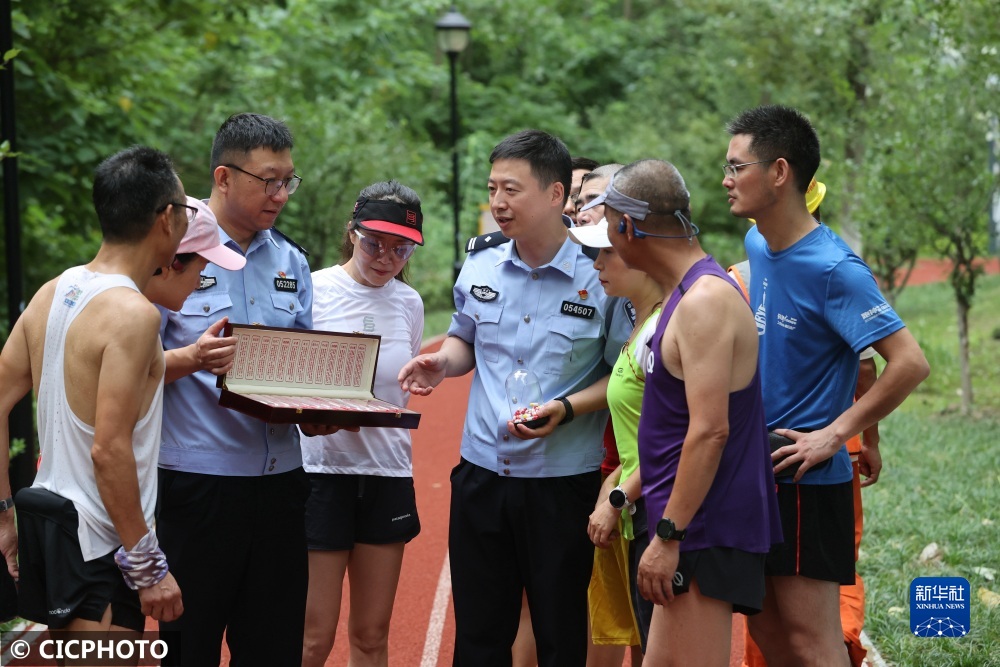 ↑2022年6月24日,民警在浙江省湖州市德清县阜溪街道的“禁毒智慧跑道”向市民讲解毒品危害。CICPHOTO/谢尚国 摄