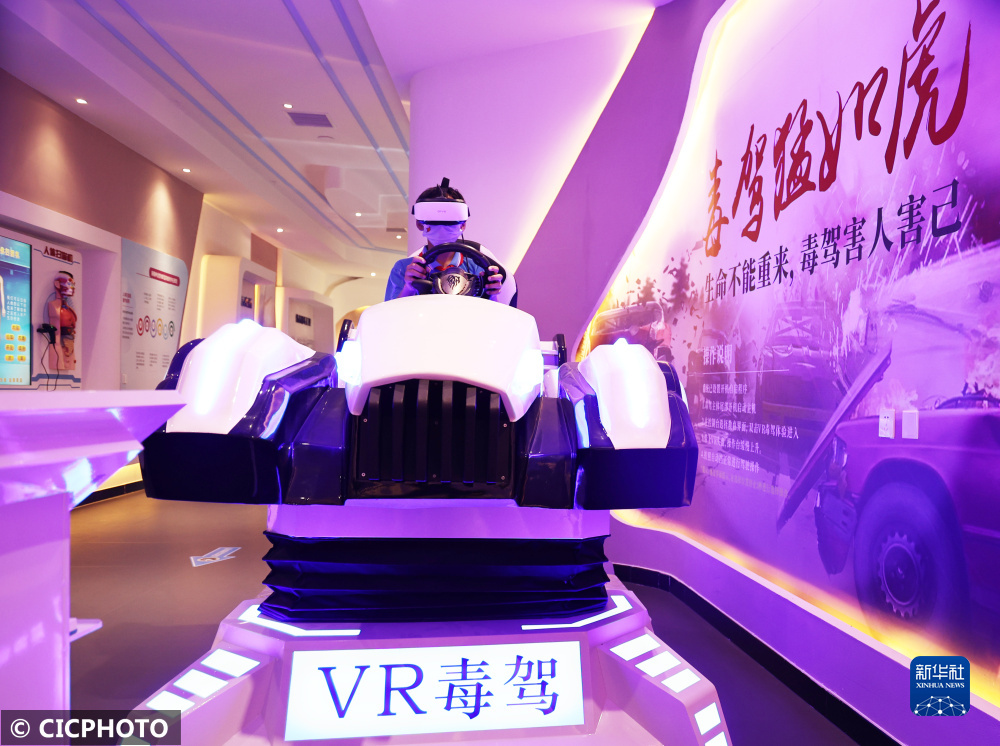 ↑2022年6月24日,河北省邢台市广宗县第三中学学生在禁毒教育基地体验VR毒驾模拟场景。CICPHOTO/刘素志 摄