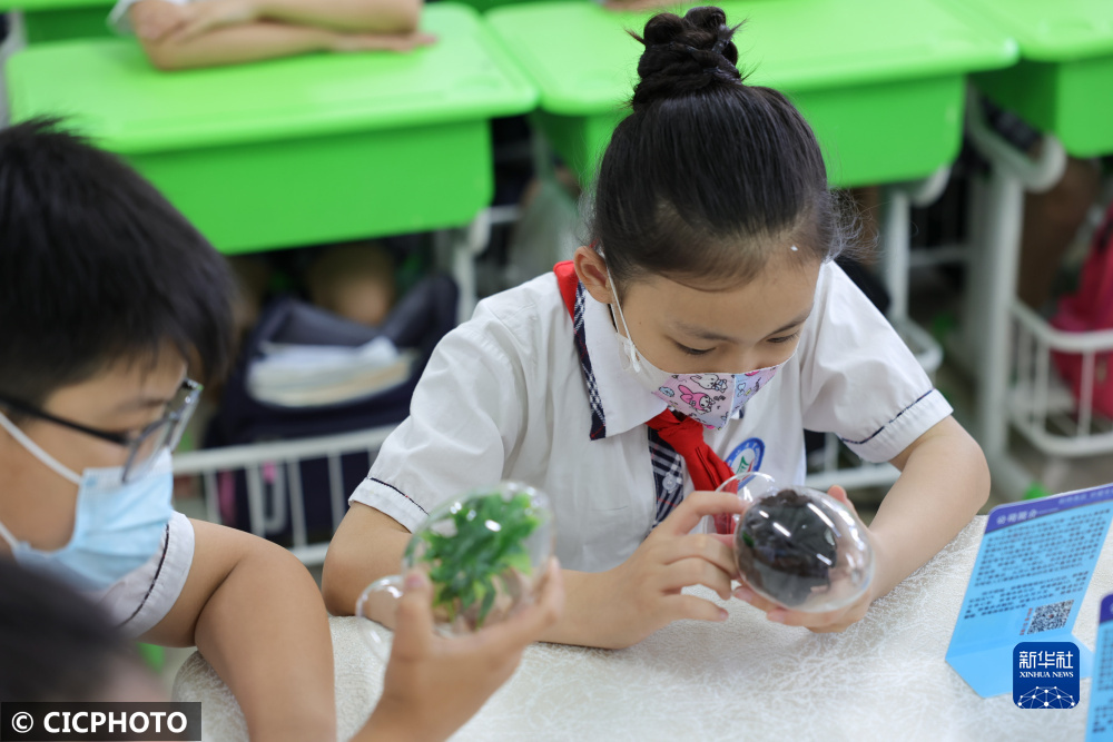 ↑2022年6月24日,河北省邯郸市邯山区渚河路小学学生在禁毒宣传教育活动中观察仿真毒品样本,认识毒品。CICPHOTO/李昊 摄