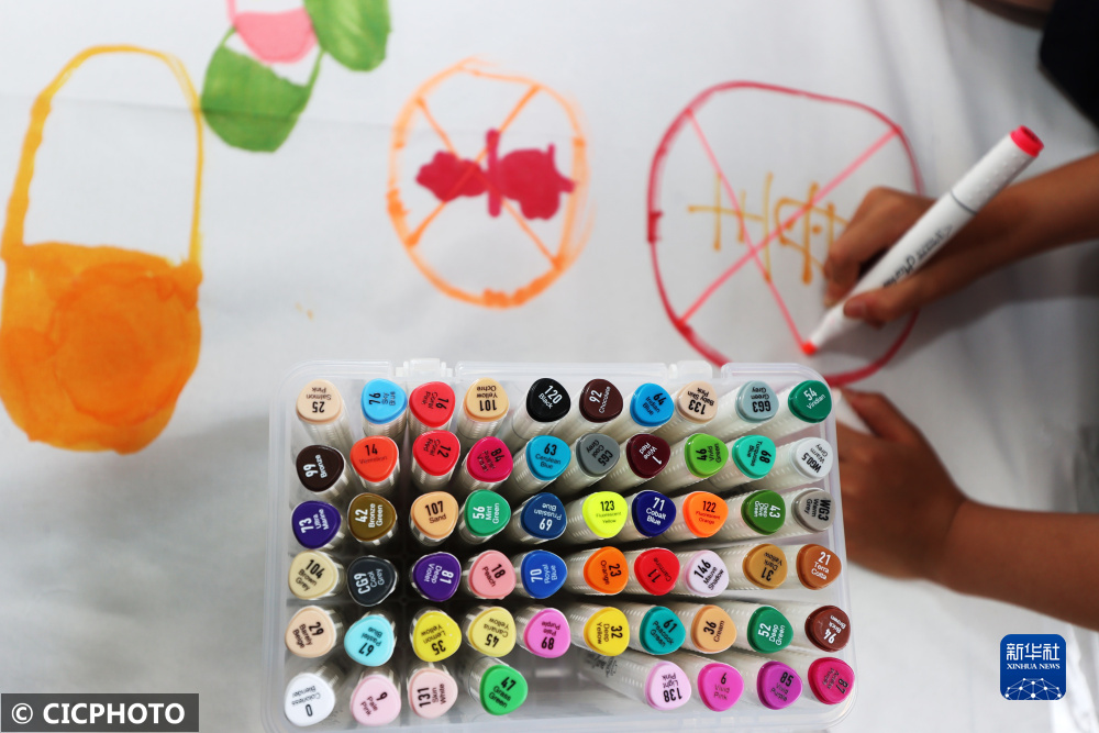 ↑2022年6月23日,浙江省湖州市东风小学教育集团南华路校区学生在禁毒宣传教育活动中创作禁毒宣传画。CICPHOTO/何伟卫 摄