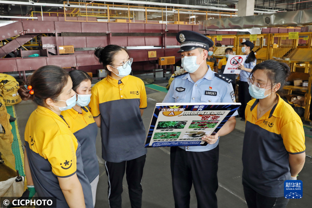 ↑2022年6月23日,江苏省扬州市宝应县公安局泾河派出所民警在辖区一家物流基地向工人宣传禁毒知识。CICPHOTO/沈冬兵 摄