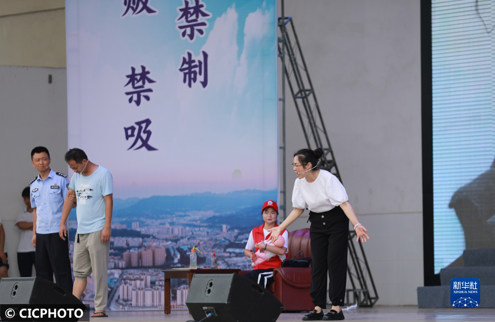 ↑2022年6月23日,禁毒宣传队队员在湖北省宜昌市秭归县职教中心表演情景剧,向全体师生进行禁毒宣传教育。CICPHOTO/吴令剑 摄