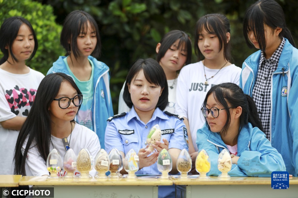 ↑2022年6月22日,在贵州省黔西市雨朵镇雨朵中学,民警用仿真毒品样本向学生讲解毒品危害。CICPHOTO/周训超 摄