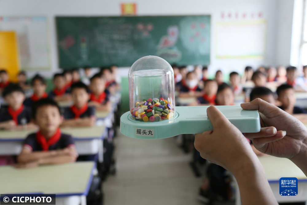 ↑2022年6月21日,在河北省邢台市平乡县县直第三小学,司法局工作人员用仿真毒品样本向学生讲解毒品危害。CICPHOTO/范钦龙 摄
