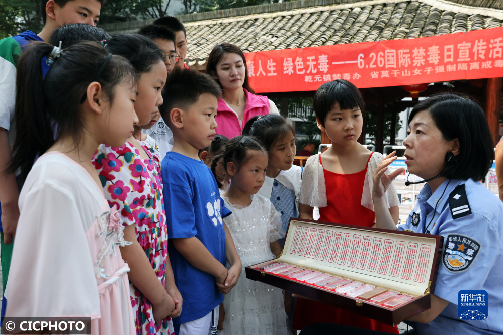 ↑2022年6月18日,民警在浙江省湖州市德清县乾元镇余不弄给孩子们讲解毒品危害。CICPHOTO/倪立芳 摄