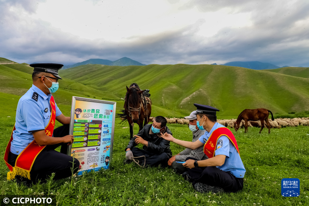 ↑2022年6月16日,在新疆维吾尔自治区伊犁哈萨克自治州霍城县,禁毒宣传“流动小课堂”分队民警向偏远牧区牧民群众讲解毒品危害。CICPHOTO/王鹏飞 摄