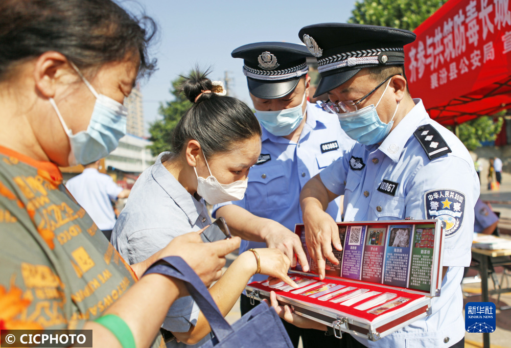 ↑2022年6月13日,民警在山西省临汾市襄汾县中心广场向群众讲解毒品危害。CICPHOTO/李现俊 摄