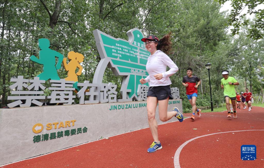 6月24日,市民在浙江省湖州市德清县阜溪街道“禁毒智慧跑道”参加禁毒健康公益跑活动。 6月26日国际禁毒日前,各地开展形式多样的禁毒主题教育活动,让人们认识毒品危害、远离毒品。 新华社发(谢尚国 摄)