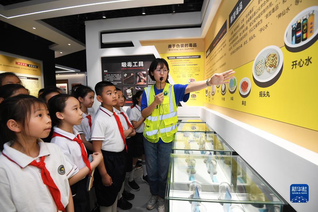 6月23日,贵州省贵阳市南明区禁毒预防教育基地的解说员给学生们讲解毒品的种类、特征等相关知识。 新华社发(赵松 摄)