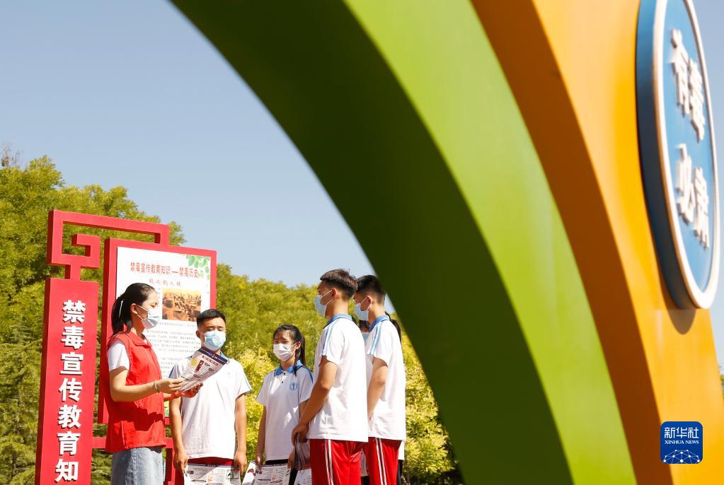 6月24日,在河北省邢台市南和区河郭镇禁毒主题公园,志愿者在为学生宣传禁毒知识。 新华社发(张驰 摄)