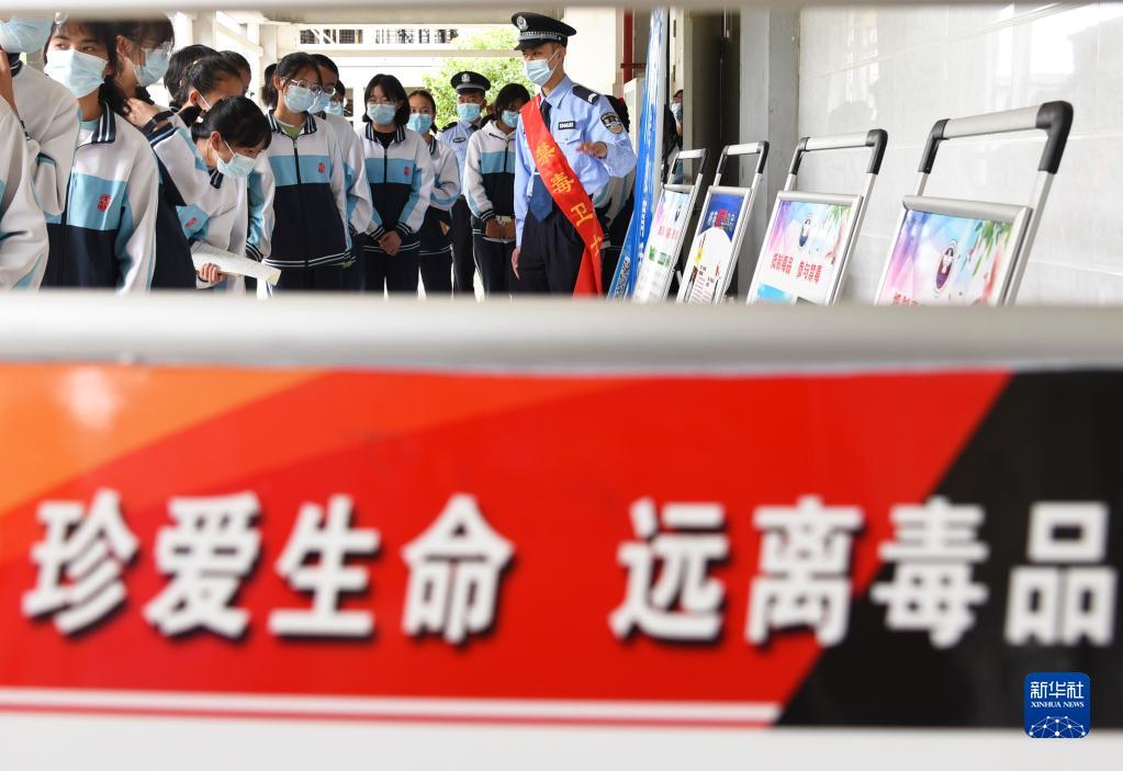 6月24日,在云南省丽江市玉龙县一中,民警向学生讲解禁毒知识。 新华社发(赵庆祖 摄)
