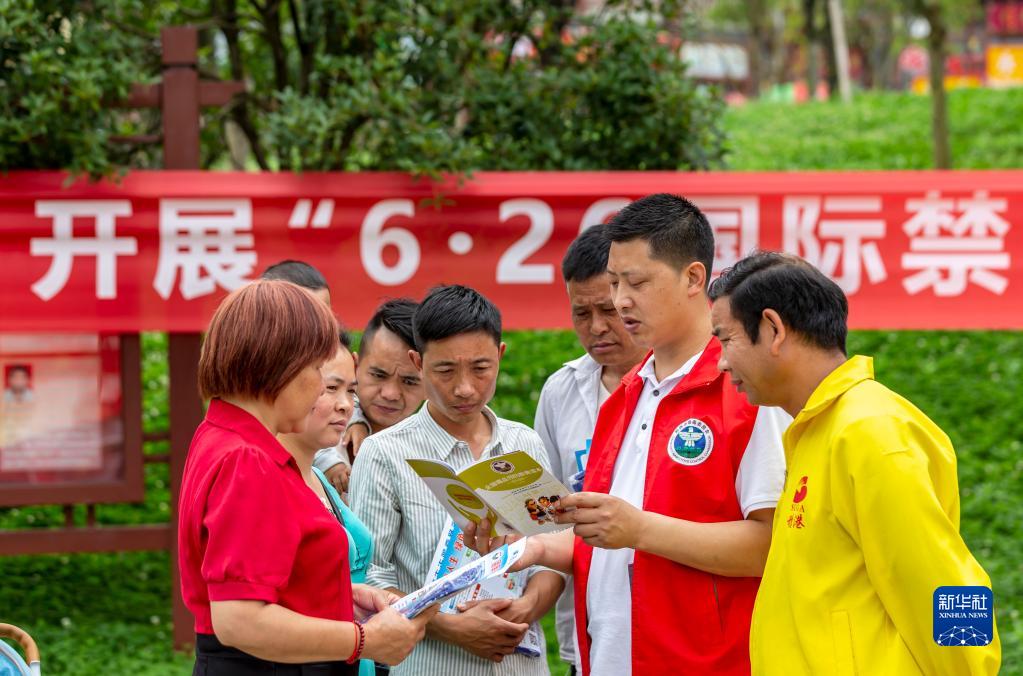 6月24日,贵州省黔西市锦绣街道开展禁毒教育宣传活动,社区志愿者向群众宣传禁毒知识。 新华社发(范晖 摄)