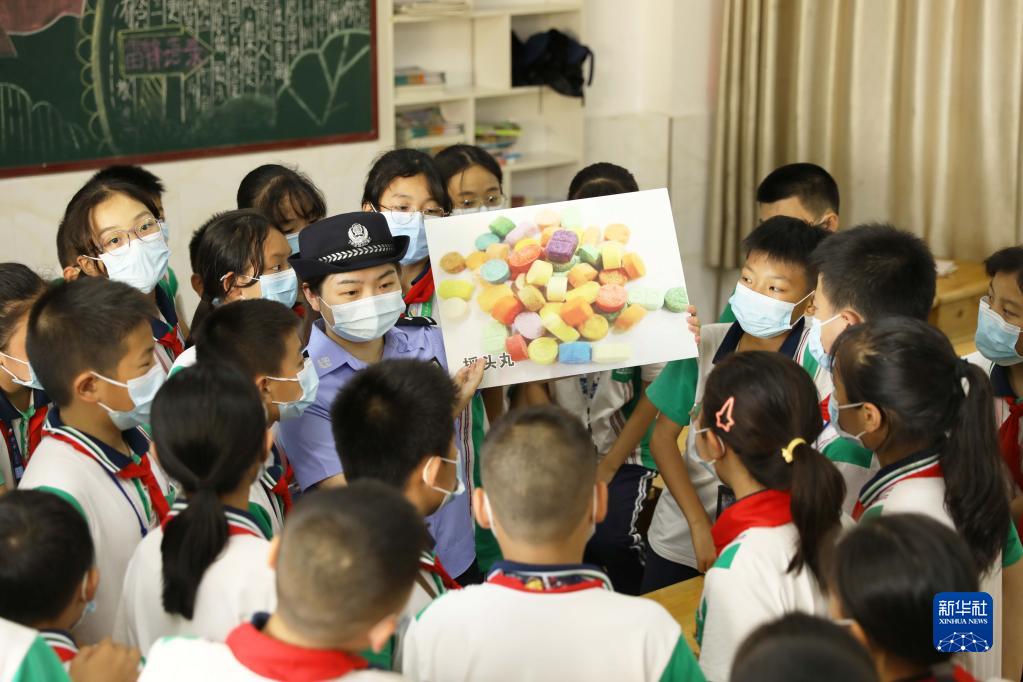 6月24日,在贵州省赤水市第二小学,民警给学生讲解新型毒品相关知识。 新华社发(杨洋 摄)