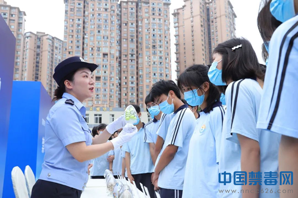 图为民警向学生展示仿真毒品。中国禁毒网发
