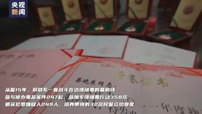 从警15年,蔡晓东一直战斗在边境缉毒的最前线,参与侦办毒品案件247起,参加专项缉毒行动358次,抓获犯罪嫌疑人249人,缴获各类毒品1609.56公斤,培养带领的32名民警立功受奖。从1609.56公斤,到1727.56公斤,数字的刷新不会停止。蔡晓东的精神,也必将在边境线上永续传承。