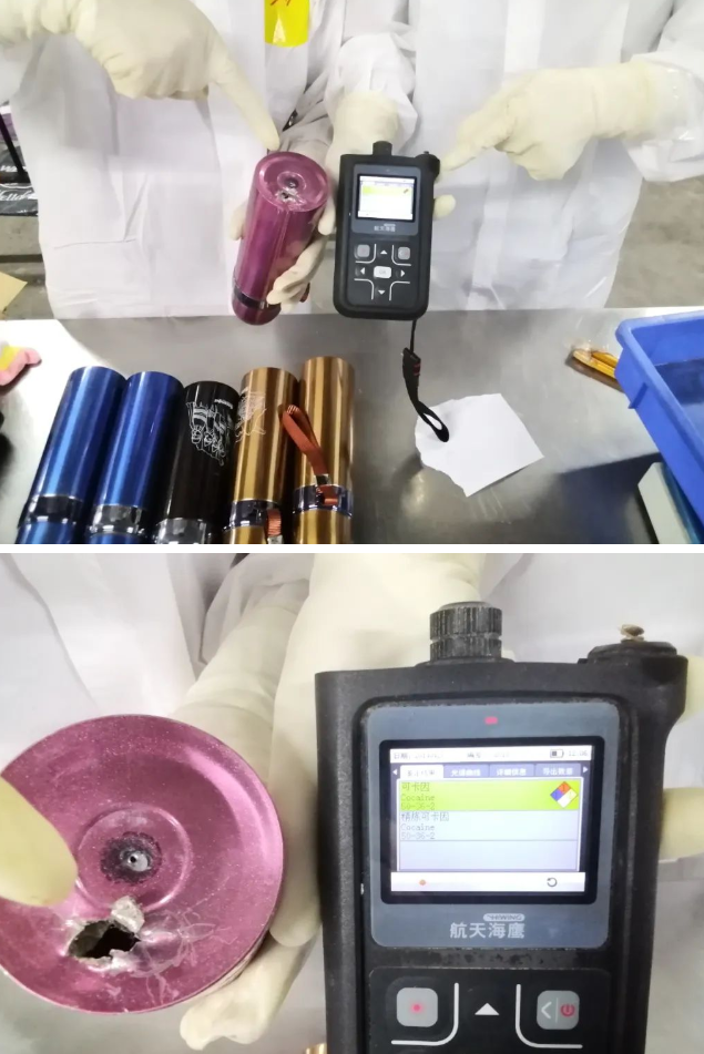 在包裹内7个金属保温杯底部夹层中查获白色晶体一批