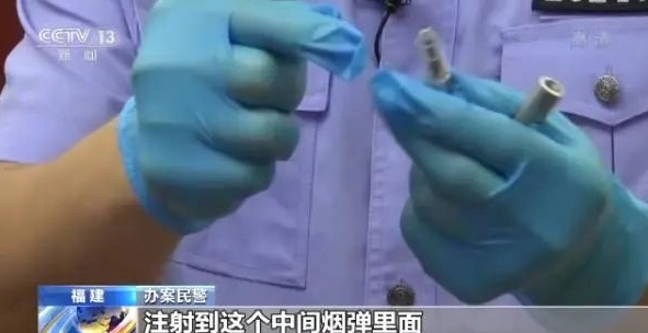 办案民警:这个是我们从嫌疑人住处缴获的一次性电子烟,嫌疑人将含有合成大麻素的电子烟油5毫升,注射到这个中间烟弹里面,然后以1支800元左右的价格向外兜售。