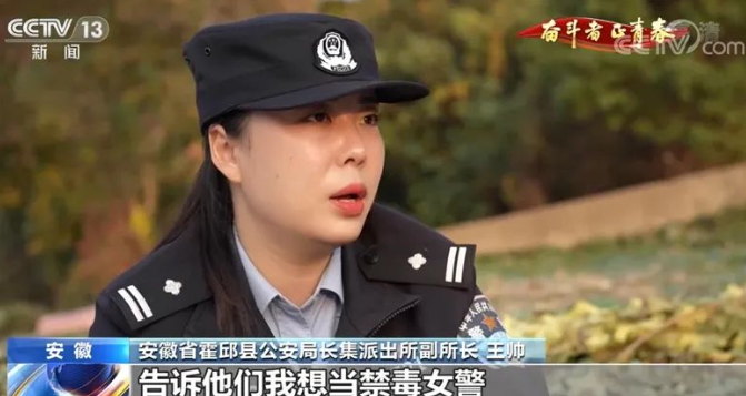 安徽省霍邱县公安局长集派出所副所长 王帅:那段时间正好是有一部热播剧,我就在想如果有一天我要是真当警察了,我一定选择禁毒警察来圆我的警察梦。然后把自己的简历打印了,告诉他们我想当禁毒女警,领导都非常吃惊,你想好了吗?怎么会选择这个岗位?我说我想好了,我是经过深思熟虑的。