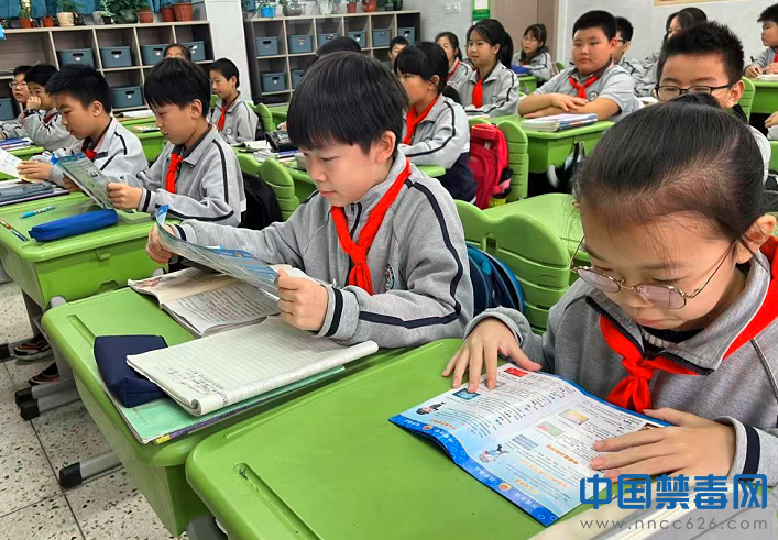 图为学生阅读禁毒宣传资料。中国禁毒网发