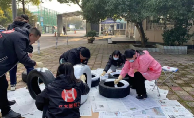 在禁毒民警和社工的带领下,同学们拿起画笔,挥洒颜料,在废弃轮胎上画出心中的“禁毒”。
