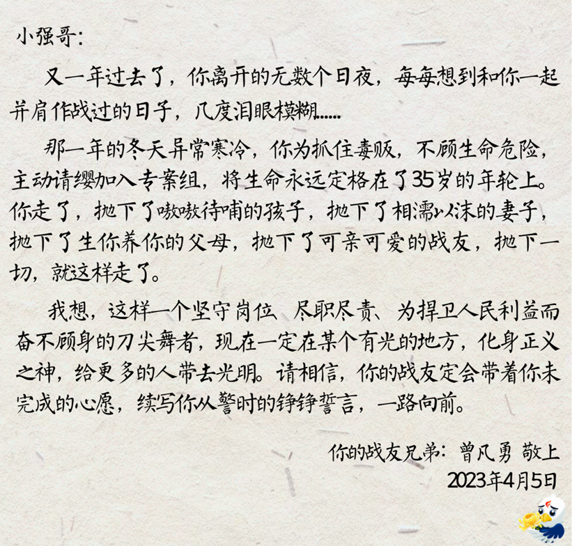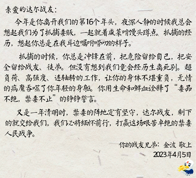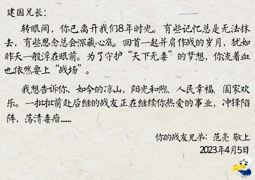 充满荆棘的禁毒路,多的是与生命的较量。每当遇见难以跨过的“鸿沟”,我们都要拼尽全力才能越过。但是,并不是每一次,我们都能成功越过。 “禁毒”二字千斤重,看得见的,是精心筹划的宣传;看不见的,是禁毒人的血泪拼搏。又是一年春草绿,梨花风起正清明。回望四川凉山禁毒的长河,我们的战友啊,有的,却永远沉睡在了“河底”。一片赤诚,一生奉献。他们化作春雨,落在心里。