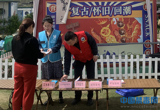 图为禁毒社工宣传小分队在活动现场摆摊。中国禁毒网发