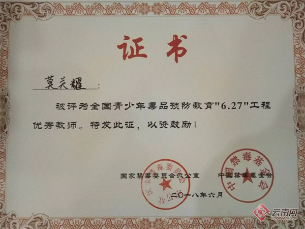 为曲靖市禁毒办所实施的“不让毒品进校园”项目,得到国家禁毒办的肯定,并且在全国予以推广;