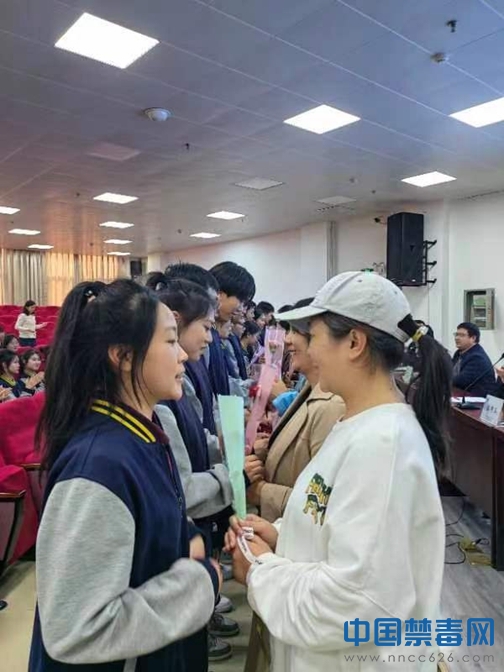 活动现场,禁毒社工在现场设置了向母亲献花的互动环节,由学生向自己的母亲献上一束康乃馨,以此表达子女对母亲的感恩之情。随后齐礼阎强戒所警察通过多媒体PPT讲解,以通俗易懂、图文并茂的形式,介绍仿真毒品模型、播放真实案例视频,生动形象地向学校师生介绍了当前毒品形势的严峻性,讲解了常见的各类毒品的成分、制作方法、危害以及预防措施,并结合真实案例向师生们展示了吸食毒品的严重后果。