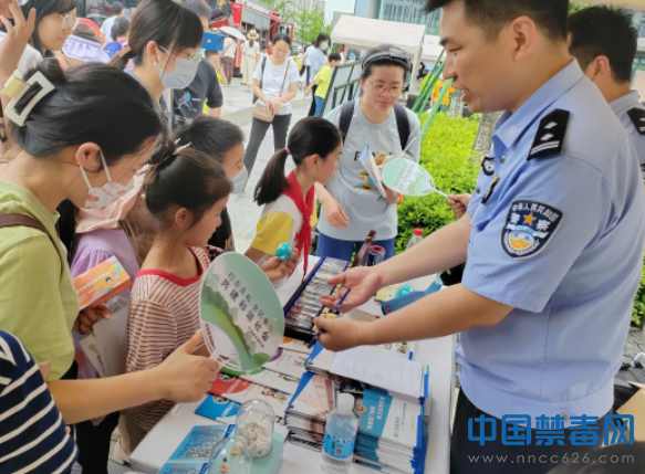 其中,鄞州区福明街道禁毒办参加了此次活动,现场由禁毒民警和禁毒志愿者组成“禁毒我代言”方阵,通过给少先队员观看毒品仿真模型、禁毒展板等方式,现场讲解各种禁毒知识,还以做答题卡发放小礼品的方式,加深少先队员对毒品危害的印象。