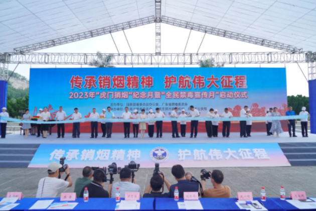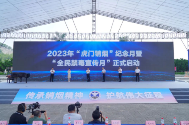 在活动主会场,现场嘉宾共同参与2023年“虎门销烟”纪念月暨“全民禁毒宣传月”启动仪式和喜粤TV广东禁毒宣教专区启动仪式;在鸦片战争博物馆分会场,青少年代表向林则徐雕像敬献花篮,主会场、分会场全体人员在林则徐后人林同楠、广东禁毒宣传形象大使杜锋的带领下进行禁绝毒品宣誓。