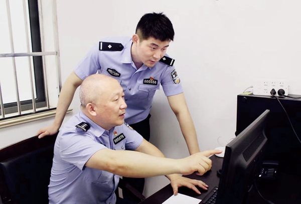 陆海东(左)悉心带教青年民警。(上海市公安局供图)