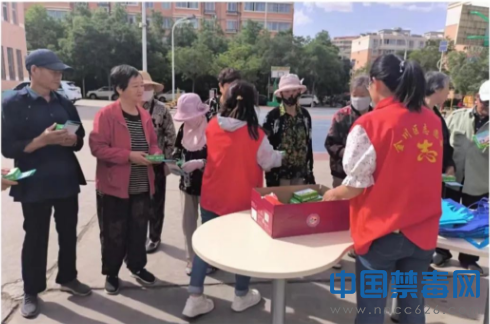图为工作人员向往来群众发放禁毒宣传册。中国禁毒网发