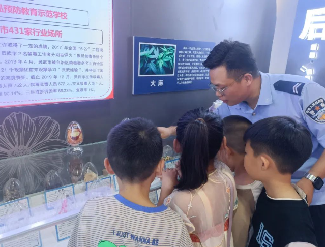 民警首先带领孩子们来到灵武市红色安全教育体验馆,让孩子们听取虎门销烟的故事、现场学习禁毒知识,并为孩子们详细讲解新型毒品的危害、伪装和辨识方法,同时引导孩子们身临其境体验各种禁毒科技设备,加深他们对毒品的认识。
