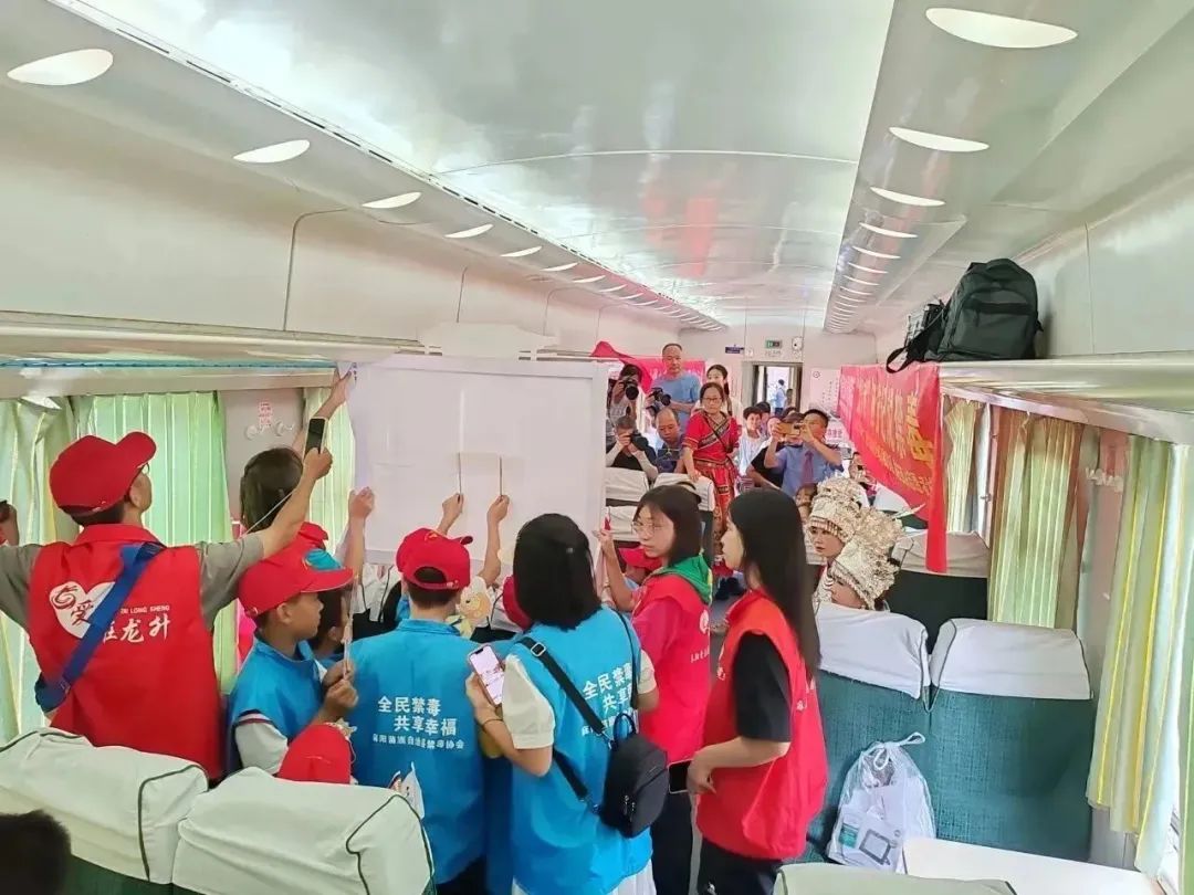 “妖精哪里跑,吃俺老猪一耙”,7月29日,禁毒志愿者带领易地搬迁社区留守儿童走上7266次列车,为车上旅客表演了禁毒皮影戏《八戒减肥》,一个个制作精美的皮影人物在孩子们的配合下栩栩如生、活灵活现,通过八戒的经历,让大家在感受中华传统文化魅力的同时,更深入地了解了毒品的危害。孩子们精彩的表演赢得了旅客的热烈掌声。