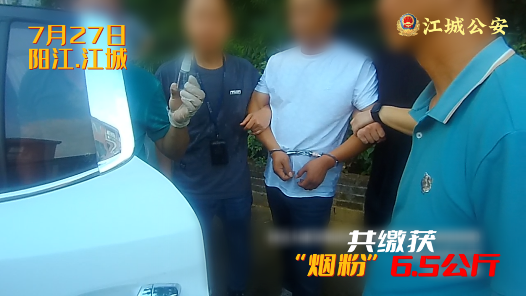 7月底,广东省阳江市公安局江城分局在工作中获悉一条涉“烟粉”线索,迅速组织警力开展侦查,掌握了犯罪嫌疑人从外省购买“烟粉”到阳江贩卖的信息。7月27日18时许,办案民警在城东街道抓获犯罪嫌疑人贺某和陈某,从涉案车辆搜出“烟粉”7包共6.5公斤。