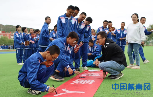 图为学生在禁毒宣传横幅上签名。中国禁毒网发