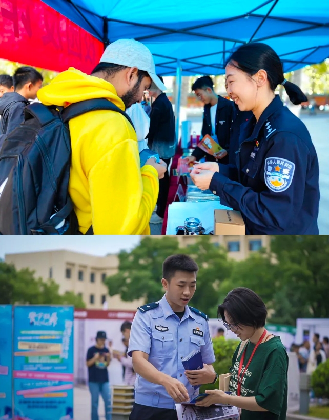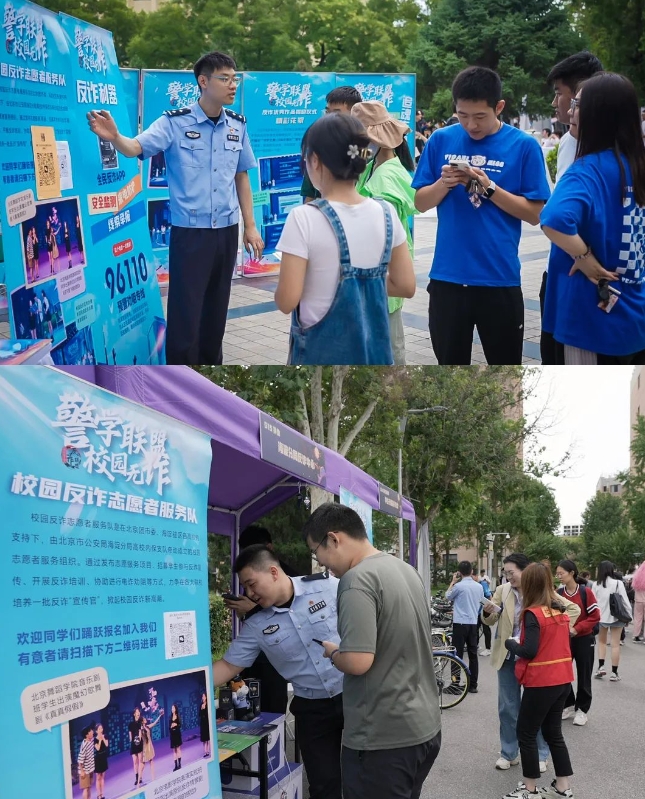 秋季新学期开学后,海淀警方在高校社团招新现场,设立反诈展位,民警和校园反诈大使、活动志愿者现场与学生面对面开展反诈提示,邀请学生参加反诈志愿者服务队,引导学生下载注册全民反诈APP,参与线上反诈知识答题,赢取公安特色礼品。活动现场热闹非凡,广大学生纷纷表示,要将学到的反诈知识讲给身边的同学和亲友,共筑防范电信网络诈骗坚实堡垒。