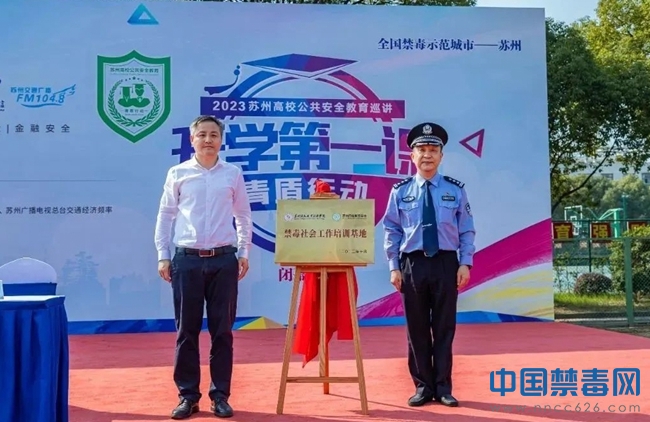 闭幕仪式上,为积极整合校地双边资源,巩固“无毒”校园成效,让大学生在社会实践中充实知识、提高技能,苏州市禁毒办副主任、公安局禁毒支队政委与苏州信息职业技术学院党委委员、副院长签署“共建大学生素质教育社会实践双基地”协议,并为“禁毒实践基地”揭牌。